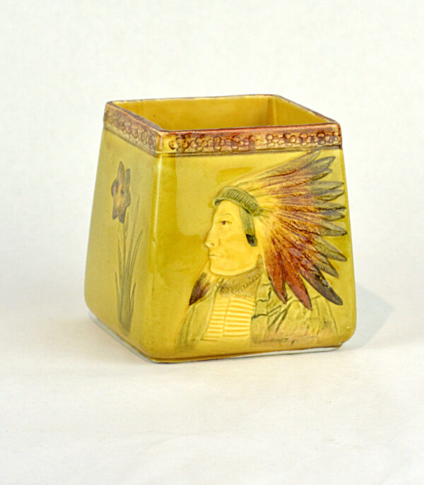 Ceramic humidor with a Native American on one side and tobacco flowers on the other sides. Probably of European origin. Late 19th century. Missing the lid.
