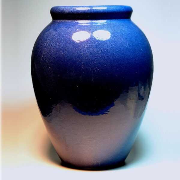 Stunning Nelson McCoy oil jar. 12 inches tall. Cobalt blue, micro crystalline glaze. A very difficult color to find. No chips or crazing. There is however a short, very tight hairline as shown. The line is just barley visible on the outside. The camera and bright lights and magnification make it much easier to see in the photo of the inside than it truly is. It was not possible to photograpgh it on the outside. There are a few light scratches as shown, but again, much easier to see in the photo than real life. Marked with conjoined NM, just visible. About 1930.