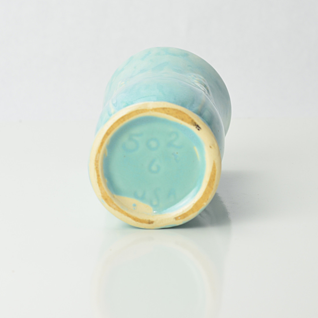 A blue and white drip glaze vase. Probably mid 20th century. 6″ tall. Marked 502-6 USA on base. Brush McCoy Pottery.