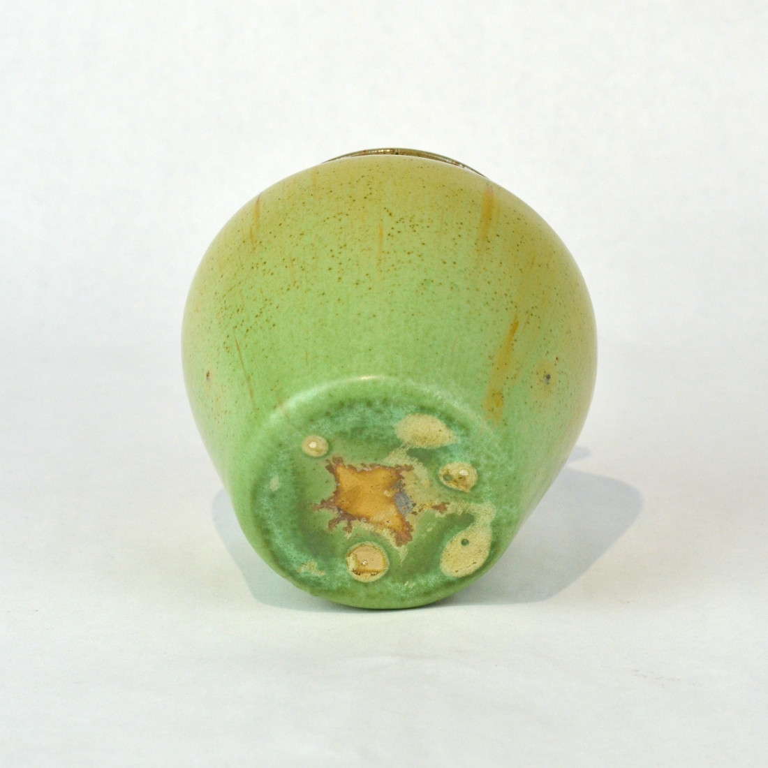 A small vase or jar with yellow green glaze. A very distinctive glaze with a peacock feather look. Possibly Fulper or early Stangl.